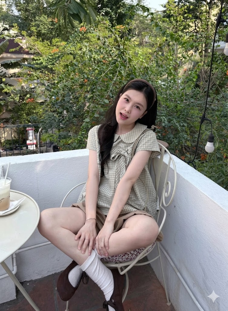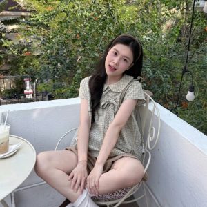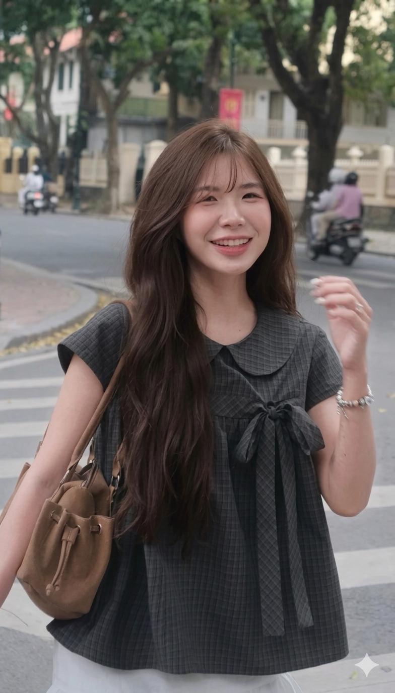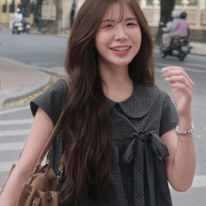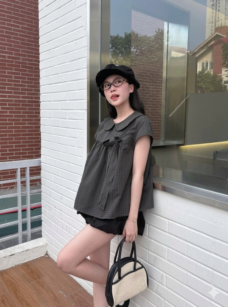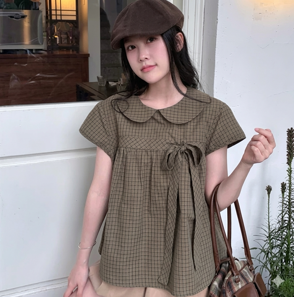 Áo babydoll kẻ caro cổ sen cài nơ